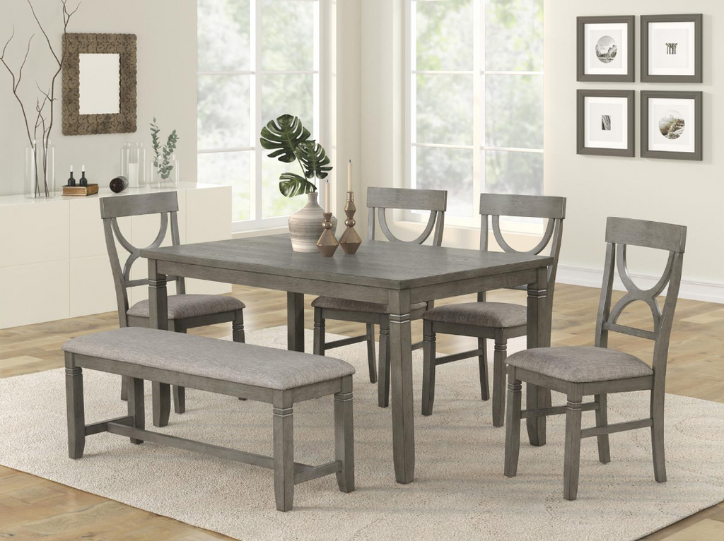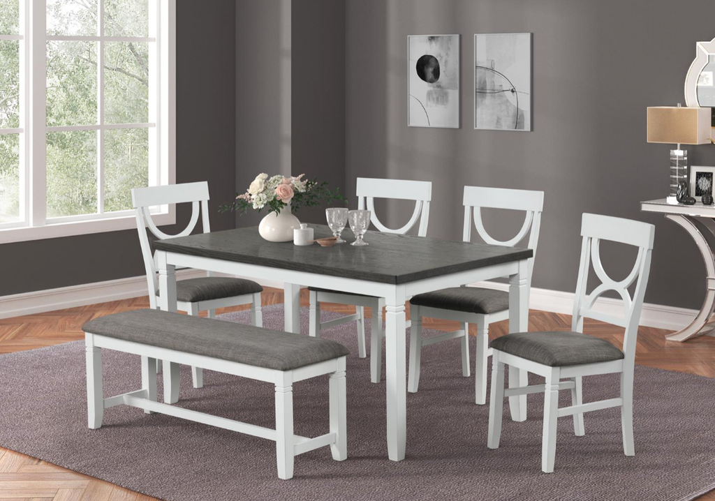 • 6 Pc Set Includes Table, 4 Side Chairs and Bench