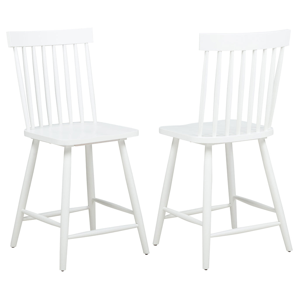 Classic and casual with a fresh farmhouse flair, this Windsor-style counter height chair features a high spindle back and gently contoured seat for timeless comfort. The clean silhouette is crafted from solid rubberwood with a rich wood veneer that enhances its natural grain. Angled legs with double stretchers offer reliable support and charm. Ideal for kitchen islands, pub tables, or counter-height dining spaces. Key Features: • Windsor-style counter height chair in light ash finish brings casual elegance to kitchen counters • High spindle back and curved seat on this counter chair support relaxed, upright dining comfort • Angled leg design adds stability while enhancing its signature farmhouse-style silhouette • Footrest stretchers provide extra comfort and structural integrity for daily use • Crafted from solid rubberwood and topped with a warm-toned wood veneer for natural appeal • Clean, timeless lines and elevated height work perfectly with counter-height tables or bars