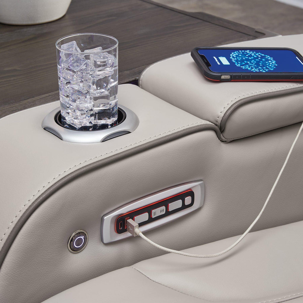 Ready to take your reclining experience to the next level? Then sit up and take notice. With this power reclining sofa, ultimate relaxation is at your fingertips. Experience the pure bliss of an air massage system and heated seats at the touch of a button. The center seat is crafted with a drop-down table with wireless charging and dual cup holders. Plus the luxurious diamond-stitched upholstery is easy on the eyes, adding elegance to any space.