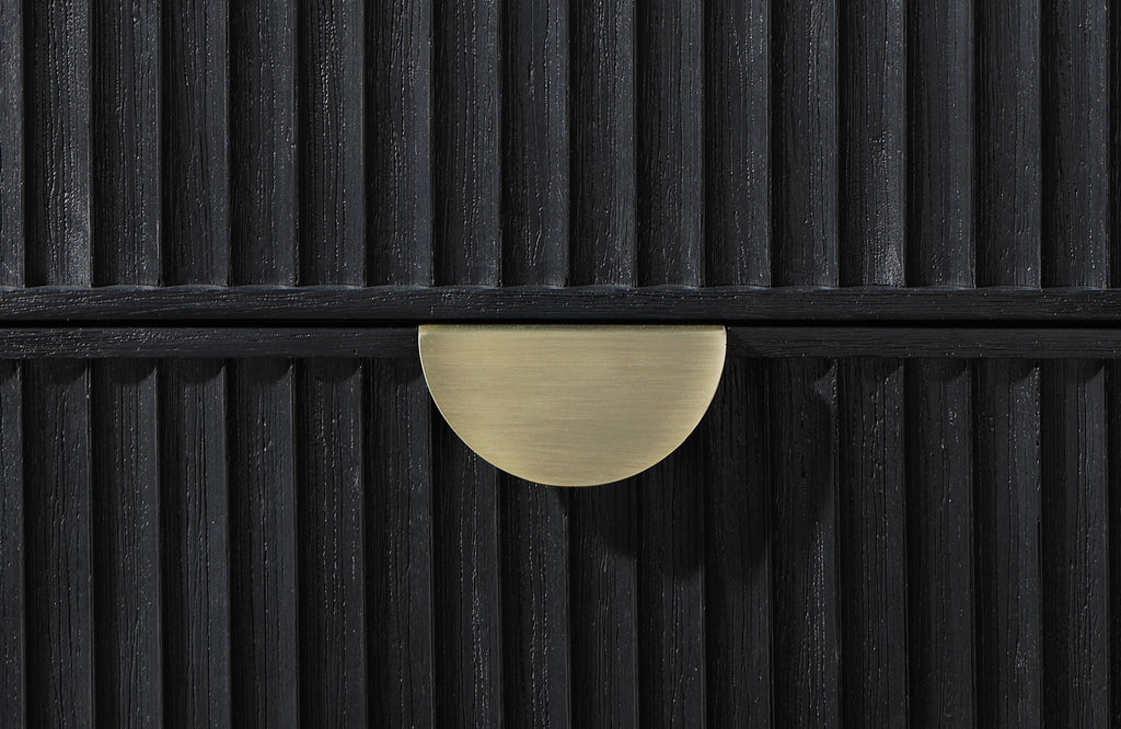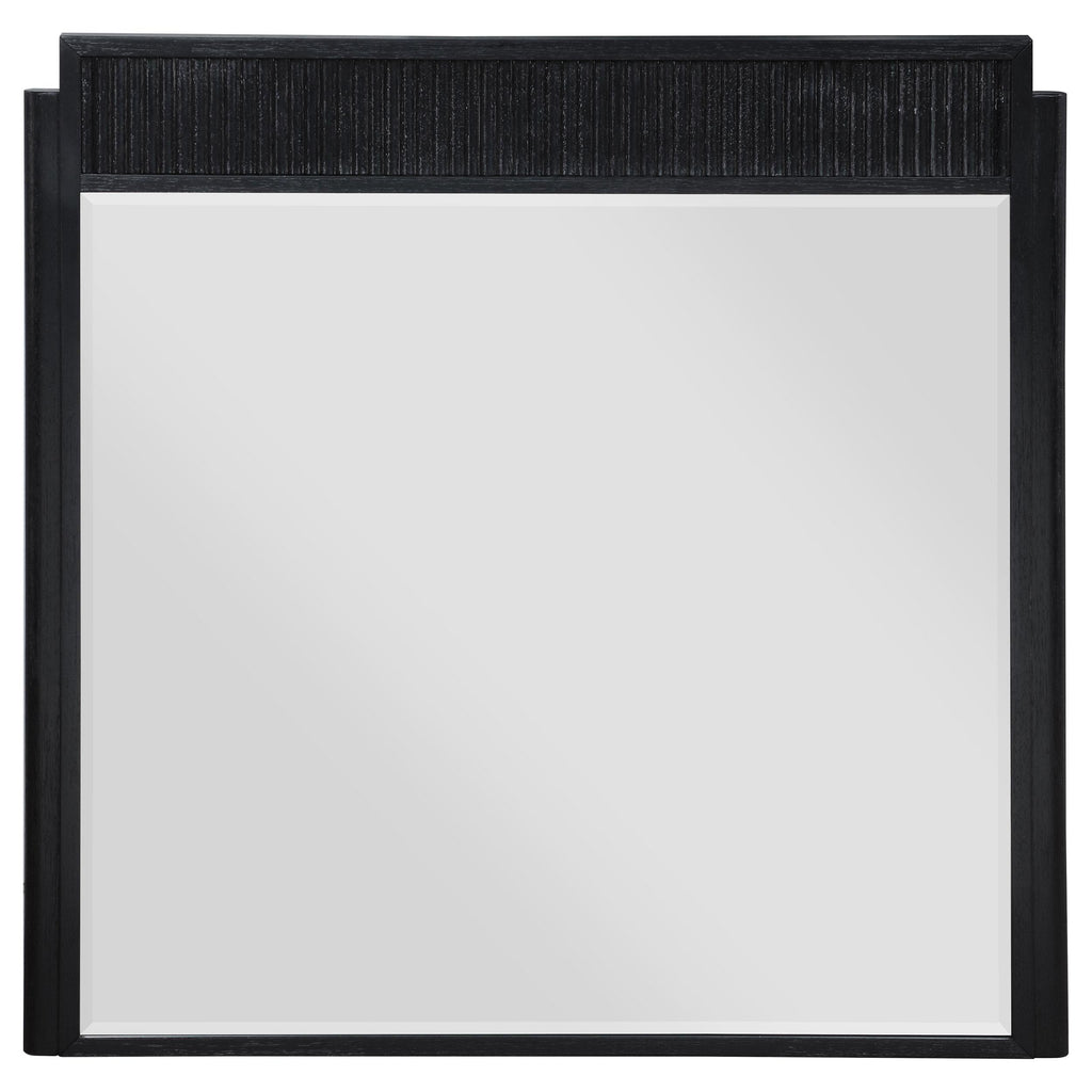 Fluted texturing and demi-lune drawer pulls perfectly accentuate the modern artistry featured in a five-piece bedroom set. Offering sophisticated presence and a wire brushed black finish, the set is a superb choice in a refined bedroom. The dresser and chest provide plenty of storage for clothing, complete with felt lined top drawers that offer protection for delicate items. Half-moon drawer pulls add stylish presence and metallic contrast. The bed centers the set, featuring a low footboard for an open, airy presentation that looks splendid with your choice of linens.