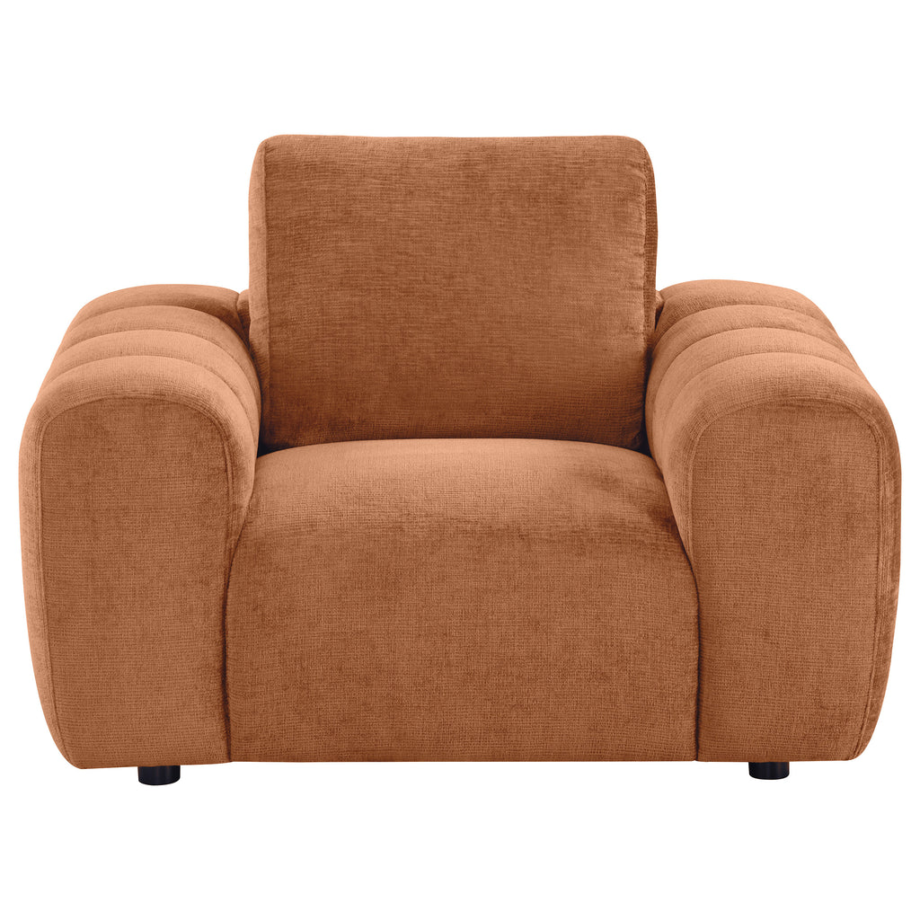 A bold expression of comfort and form, this accent chair brings sculptural presence to any space. Oversized arms and deep seating offer a cozy retreat, while its rounded silhouette adds softness and contemporary appeal. Upholstered in plush chenille and built from solid rubberwood and engineered wood, it delivers lasting comfort and durability. A standout addition to living rooms, lounges, or reading corners. Key Features: • Accent chair features a sculptural silhouette with oversized arms and bold proportions • Burnt orange chenille upholstery adds warmth and texture with ultra-soft comfort • Rounded arm shaping includes channel tufting for a dimensional, cozy feel • Deep seat and thick foam cushion provide a plush lounging experience • Durable rubberwood, plywood, and engineered wood construction ensures strength • Compact yet bold design fits perfectly in modern lounges or cozy reading corners