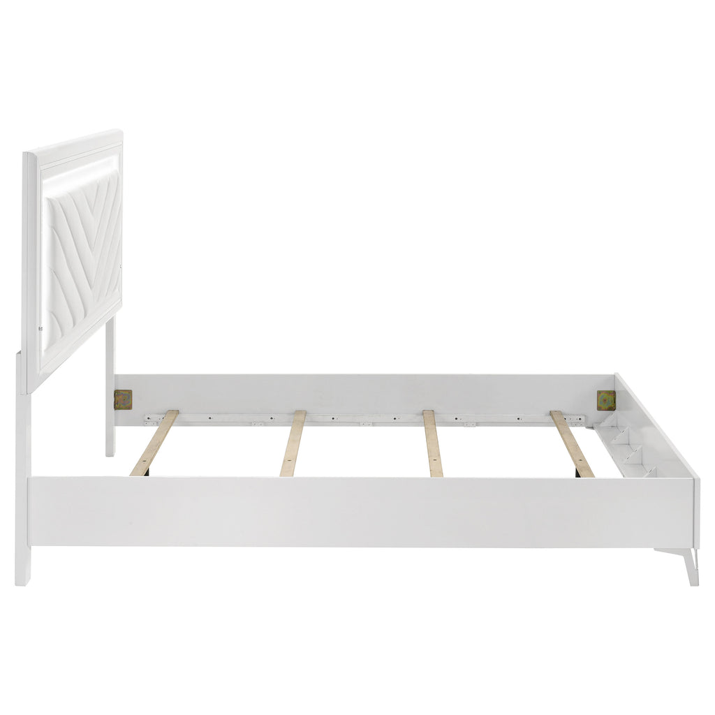 This modern bed showcases a high-gloss white frame paired with a bold LED-lit headboard for striking impact. The panel headboard features a white faux leather insert with chevron channel tufting, framed by a white LED trim that casts soft ambient light. Clean edges and chrome-finished legs enhance its sleek silhouette, while the low footboard keeps the focus on the illuminated design. A foundation is required to complete this stylish bedroom centerpiece. Key Features: • Queen bed in high gloss white finish with bold chevron-tufted faux leather headboard panel • White LED trim around headboard adds ambient lighting and striking nighttime glow • Low-profile footboard and sleek rails keep the silhouette clean and contemporary • Faux leather insert offers soft touch and durable contrast against polished frame • Chrome-finished tapered legs provide sturdy support and upscale modern detail • Crafted from engineered wood, faux leather, and foam; foundation required for use