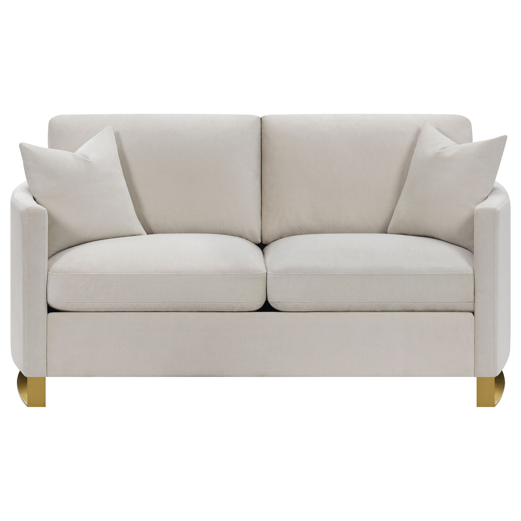 Indulge in opulent comfort with this textured velvet loveseat. Its reversible feather blend seat and back cushions, complemented by curved arms and gold stainless steel legs. Smooth upholstery and lustrous details blend simplicity with timeless splendor, making this piece a perfect focal point for refined interiors. With its inviting profile and graceful presence, it elevates both style and relaxation. Key Features: • Loveseat with plush seating designed to elevate both comfort and style • Textured velvet finish in a warm camel hue • Reversible feather blend cushions ensure adaptable support • Curved arms and gold-accented stainless steel legs add subtle luxury • Fully encased engineered wood frame with sinuous springs and pocket coils • Reversible seat and reversible back cushions for easy maintenance