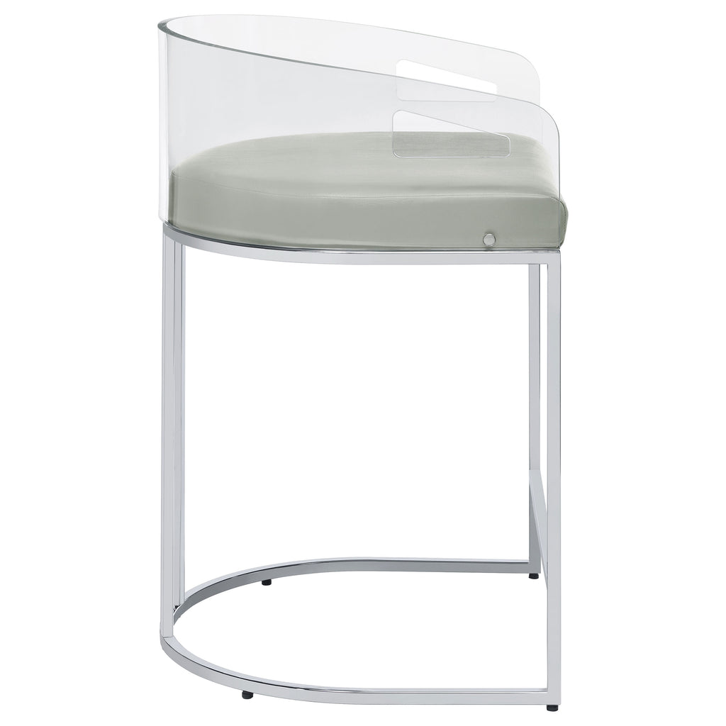 Ultra-modern with a retro-inspired vibe, this pair of stools make a striking piece to a dining room space. With a curved backrest in a clear acrylic material, each stool offers an open and airy design. Rest comfortably on a leatherette cushion as you dine or sip a cocktail. In addition, each stool is supported by a slim metal legs in a lustrous chrome finish and a base shape that mimics the rounded acrylic backrest. Pull up a pair of these stools to a kitchen bar or complete a compact home bar. Key Features: • Ultra-modern with a retro-inspired vibe, these stools feature a curved backrest in a clear acrylic material, leatherette cushion, and slim metal legs in a lustrous chrome finish • Base shape mimics the rounded acrylic backrest for a cohesive look • Open and airy design offers a comfortable seating experience • Ideal for a kitchen bar or compact home bar • Striking piece to a dining room space