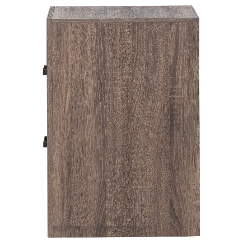 This two-drawer nightstand brings modern style and practical storage to the bedside. Its clean-lined frame complements contemporary spaces, while two spacious drawers provide room for nighttime essentials. Dark bronze handles contrast beautifully against the engineered wood construction and durable laminate veneer. Designed for everyday use, this nightstand offers both style and function in a compact footprint. Key Features: • Two-drawer nightstand with a sleek and modern silhouette • Barrel oak finish enhances the warm, natural wood grain look • Spacious drawers provide storage for bedside essentials and more • Sturdy engineered wood construction ensures lasting durability • Matte dark bronze handles offer a stylish contrast to the finish • Durable laminate veneer resists scratches, stains, and wear