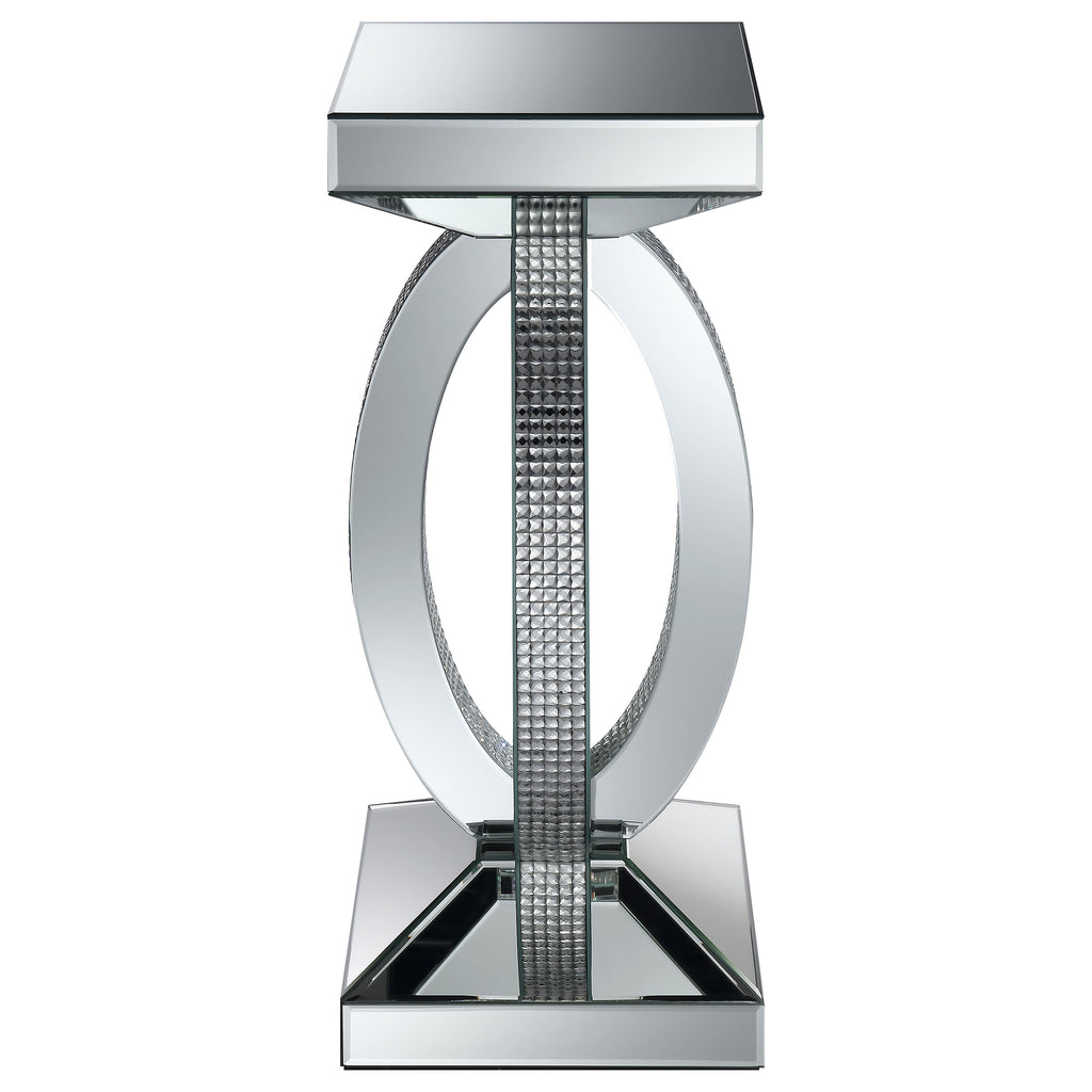 This chic and contemporary end table captivates with its sculptural, artistic design. Crafted with mirrored surfaces and engineered wood, it exudes modern luxury. The intersecting oval-shaped loops form a striking, three-dimensional silhouette, enhanced by sparkling rhinestone accents. A sturdy square base and tapered top complete the bold aesthetic, making it a glamorous centerpiece for any contemporary living space. Key Features: • Glamorous end table with a sculptural, artistic design • Made with mirrored surfaces and engineered wood for modern appeal • Intersecting oval-shaped loops create a dynamic silhouette • Rhinestone accents add a touch of sparkle and elegance • Sturdy square base and tapered top ensure stability • Perfect for enhancing any contemporary living area