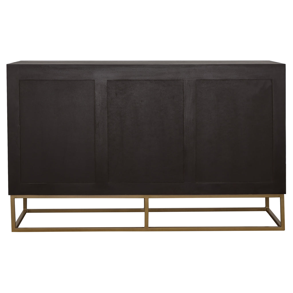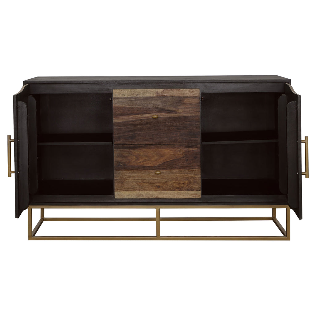 A handcrafted accent cabinet from India makes its presence known. With its mix of natural wood colors, it'll instantly captures attention in your living area. Gold hardware with a matching geometric base provides durability and aesthetic flair. Two large cabinet doors hold your valuables within. Neatly arrange your items on the single interior shelf. Key Features: • Handcrafted from sheesham and acacia wood with artistic wood grain • Gold metal base and handles add sleek contrast to natural tones • Two cabinet doors open to a single interior shelf for storage • Painted doors enhance the cabinet’s unique appearance • Ideal for entryways, living rooms, or dining areas • Made in India and constructed from solid wood, engineered wood, and metal