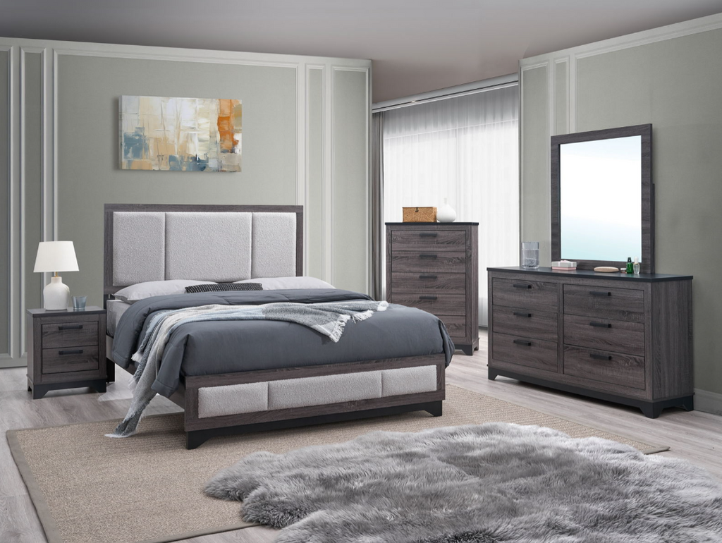 4 Pc Bedroom Set includes Queen Bed, Dresser, Mirror and Chest