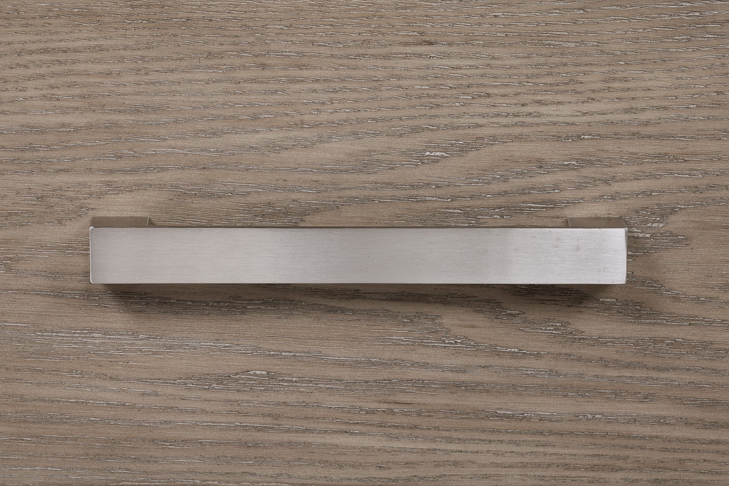 Chrome finish bar pulls add a touch of shine to the neutral barley brown finish of a modern five-drawer chest. Delivering ample storage with a compact footprint, the chest features a streamlined silhouette with mitered trim that creates a sense of depth. The top provides an easy spot for decor or a jewelry box that brings a personal touch. The soft wood grain finish of the chest complements in a variety of bedroom settings, making this a versatile choice for your home. The look is complete with a recessed base that provides a touch of height and airy presence.