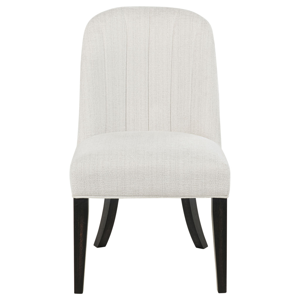 Graceful by design and soothing in tone, this upholstered dining chair invites lingering with every curve. Draped in creamy fabric, its gently channeled backrest rises in soft vertical lines, embracing you in subtle elegance. Burnished black legs flare with sculptural ease, grounding the silhouette in warm contrast. From candlelit dinners to quiet morning coffees, this chair offers a seat not just at the table, but at the heart of the home. Key Features: • Dining side chair wrapped in cream fabric with subtle channel tufting along the back • High back design offers supportive comfort for long meals and conversation • Burnished black flared legs contrast beautifully against the light upholstery • Foam-padded seat and backrest provide soft, resilient cushioning • Crafted from rubberwood, engineered wood, and performance fabric • Perfectly pairs with round or rectangular tables for modern, timeless appeal