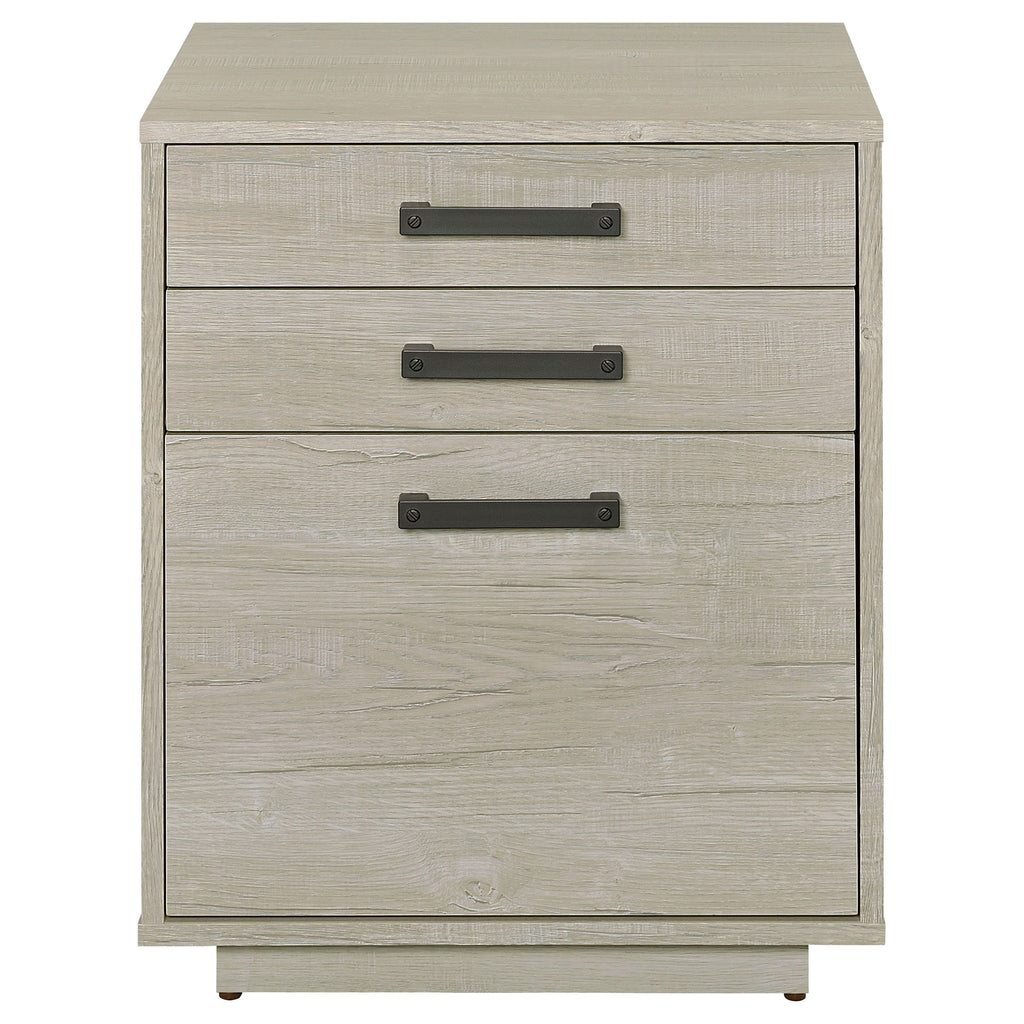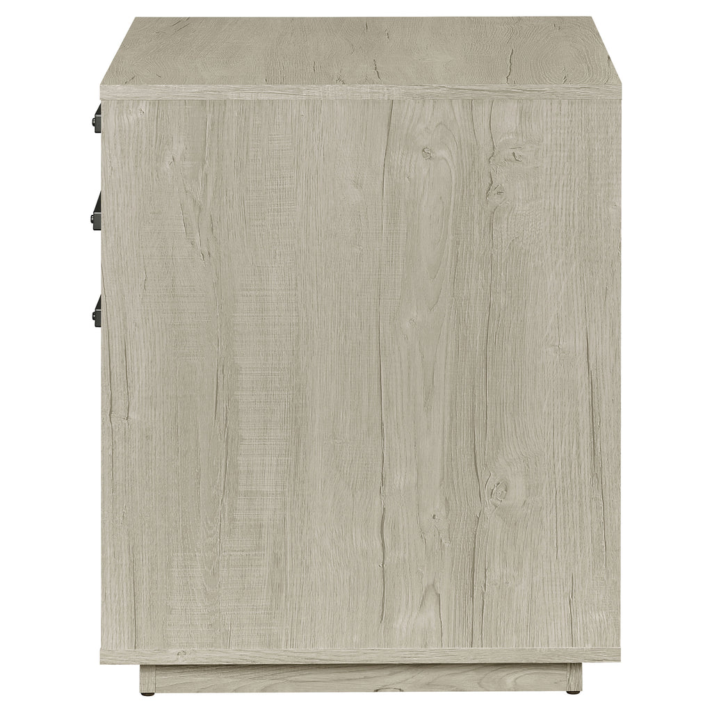Streamline your workspace with this modern file cabinet, designed to enhance both form and function. The clean, box-style silhouette is finished in a soft whitewashed grey that brightens any office setting. Three spacious drawers provide organized storage for files, stationery, and office essentials. Sleek gunmetal bar pulls add an industrial touch, balancing the light tone with subtle contrast. Built from engineered wood and a durable laminate veneer, it offers strength and everyday practicality. Key Features: • File cabinet with three drawers for files, supplies, and office accessories • Whitewashed grey finish offers a light, contemporary aesthetic • Gunmetal bar pulls provide subtle industrial contrast and grip • Engineered wood with laminate veneer ensures surface durability • Compact cube shape fits under or beside standard desks • Ideal for modern home office, study, or shared workspaces