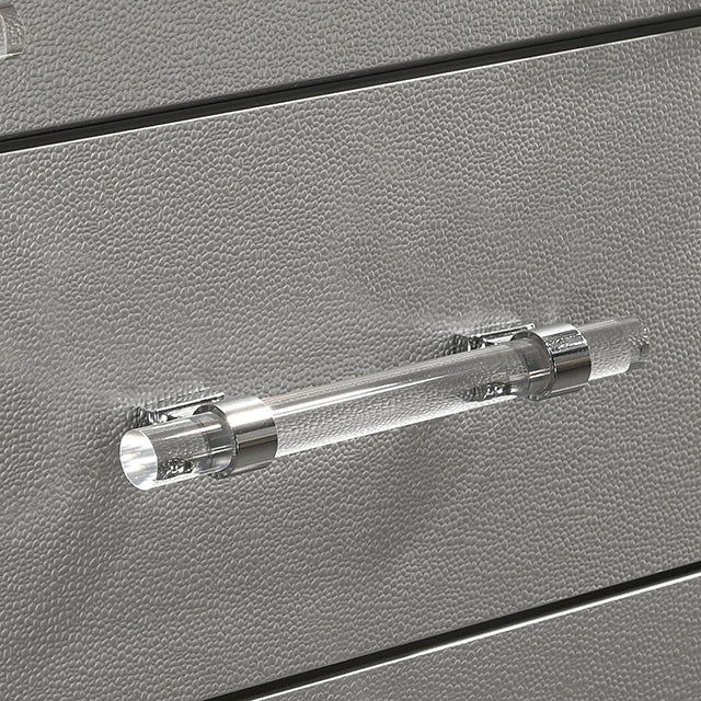 Create a room made for a princess with this bedroom set from the Maddie Collection. The curved headboard is padded and upholstered in a horizontally-tufted fabric, emphasizing the pearl white finish. The dresser and chest feature acrylic legs, crystal accents, and a beveled mirror with a LED light creating a glamorous aesthetic. Give into your glitzy side with this opulent set.