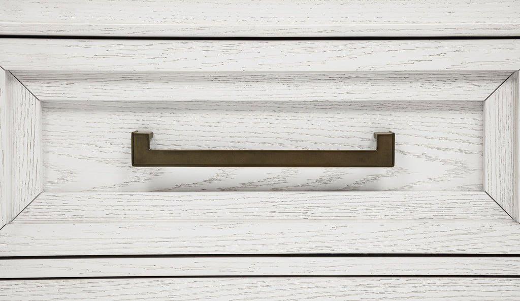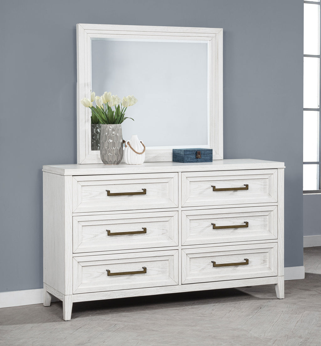 Introduce fresh style and inviting texture with a modern six-drawer dresser and framed mirror. It shows off a distressed white finish over wood grain texture, offering an inviting look and feel in your living room. Each drawer front features layered trim that creates depth and is augmented with a long bar pull in antique brass finish to create contrast. The mirror on top features a squares silhouette with layered trim that matches drawer fronts. Tapered legs complete the look and a tip over restraint is included to add safety in your bedroom. Key Features: • A modern six-drawer dresser with a framed mirror offers a clean-lined silhouette and lots of storage • Distressed white finish highlights wood grain details and bar hardware to create texture and depth • Dresser includes six drawers of equal size, perfect for clothing, accessories and even linens • Tip over restraints are included to add safety and peace of mind to this stylish set