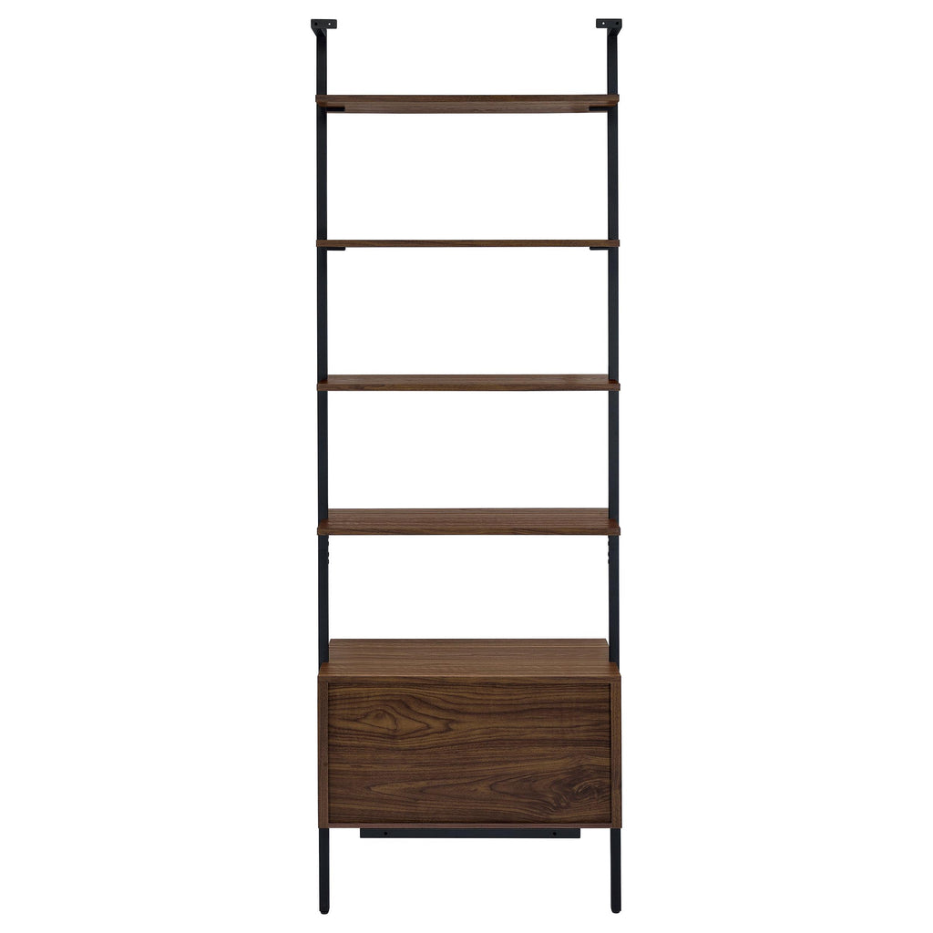 Elevate your home with this modern three-piece bookshelf set, combining sleek design with practical storage solutions. This set features two open shelf bookcases and one bookcase with drawers, each offering a refined and airy ambiance that complements any contemporary space. The open shelves are perfect for showcasing books, decor, and personal treasures, all set within a black metal frame that adds stability and minimalist appeal. The central bookcase includes two drawers, providing hidden storage to keep your space organized and clutter-free. Finished in a warm walnut tone, this versatile bookshelf set is ideal for creating a cohesive, stylish display in your living room, home office, or dining area. Key Features: • Three-piece bookshelf set includes two open shelf bookcases and one bookcase with drawers • Sleek, modern design with black metal frames and warm walnut finish • Six open shelves per bookcase for ample display space • Central bookcase features two drawers for some enclosed storage • Ideal for living rooms, home offices, or dining areas to create a cohesive, stylish look