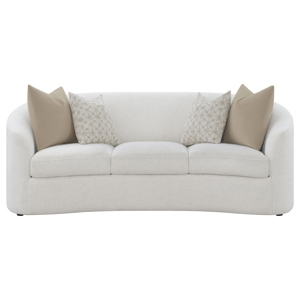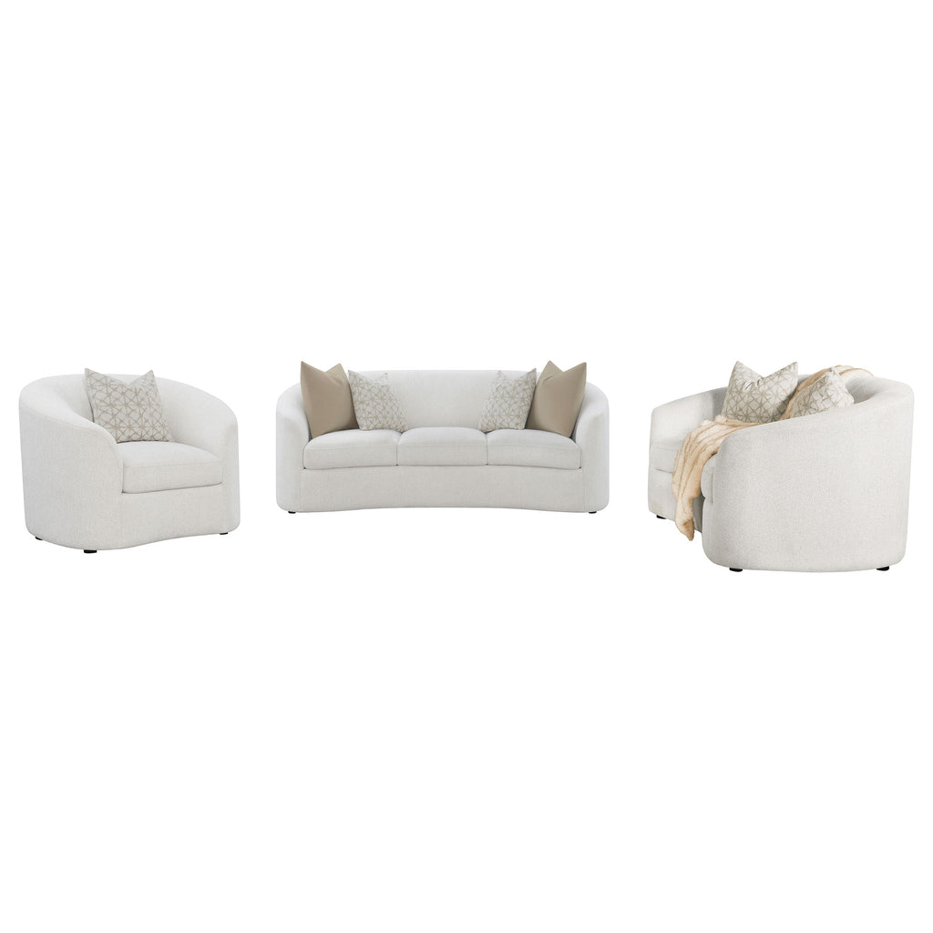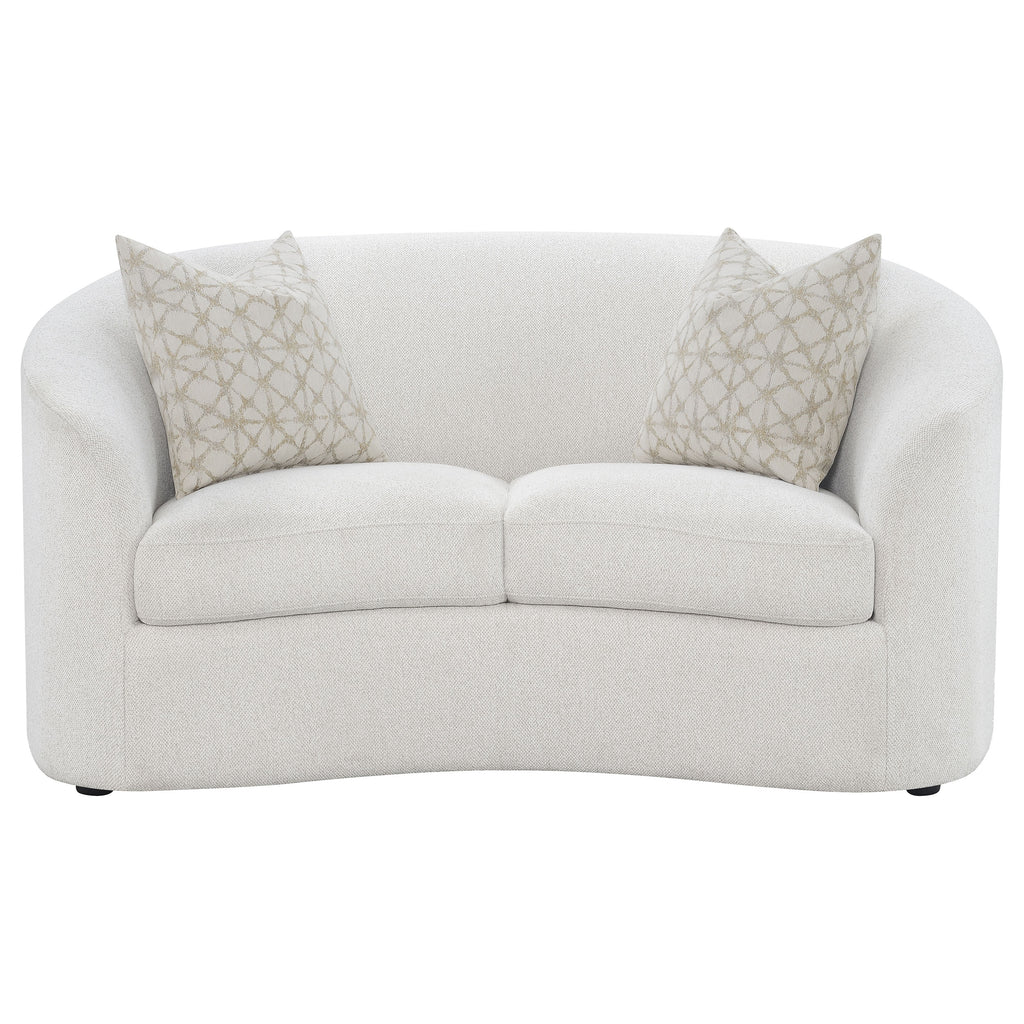 The living room set captures the perfect balance of modern warmth and sculptural design. Each piece is wrapped in soft latte boucle upholstery, creating a cozy yet elevated texture. Curved silhouettes and sloped armrests lend a contemporary feel, while plush cushions and tailored backs ensure enduring comfort. Accent pillows with faux down fill add inviting softness and refinement. Blending timeless craftsmanship with modern aesthetics, this collection transforms any living space into a serene and stylish retreat._x005F_x000D_ Key Features: • Two-piece sofa set wrapped in soft latte boucle upholstery texture • Curved silhouettes highlight contemporary design and fine tailoring • Plush seat cushions and tight backs ensure comfort and longevity • Sloped armrests add smooth, sculptural balance to each piece • Accent pillows with faux down fill complete the inviting ensemble • Ideal for smaller living spaces seeking comfort and modern warmth
