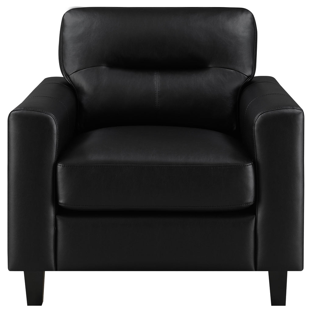 Unified by tailored silhouettes and softened edges, this seating set transforms the living room into a calm, intentional space. Smooth upholstery flows across deep cushions and wide arms, inviting rest and connection. Refined stitching and balanced lines ground each piece in quiet strength. Built for lasting comfort, this collection merges modern scale with everyday serenity and room-defining style. Key Features: • Living room seating set with bold track arms and supportive cushion structure • Black leatherette upholstery defines each piece with soft matte uniformity • Topstitched cushions offer firm comfort with a tailored, symmetrical look • Black legs unify the base and maintain a clean, streamlined presentation • Made from pine, plywood, high-density foam, and polyurethane leatherette • Designed to deliver durability and coordinated style across living spaces